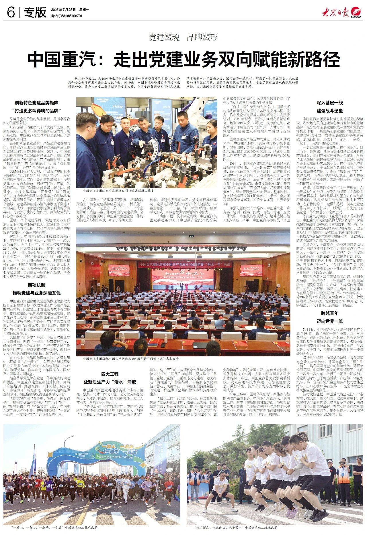 7月28日,《大众日报》整版报道中国重汽党建工作成效,展现企业以高质量党建引领高质量发展的生动实践。