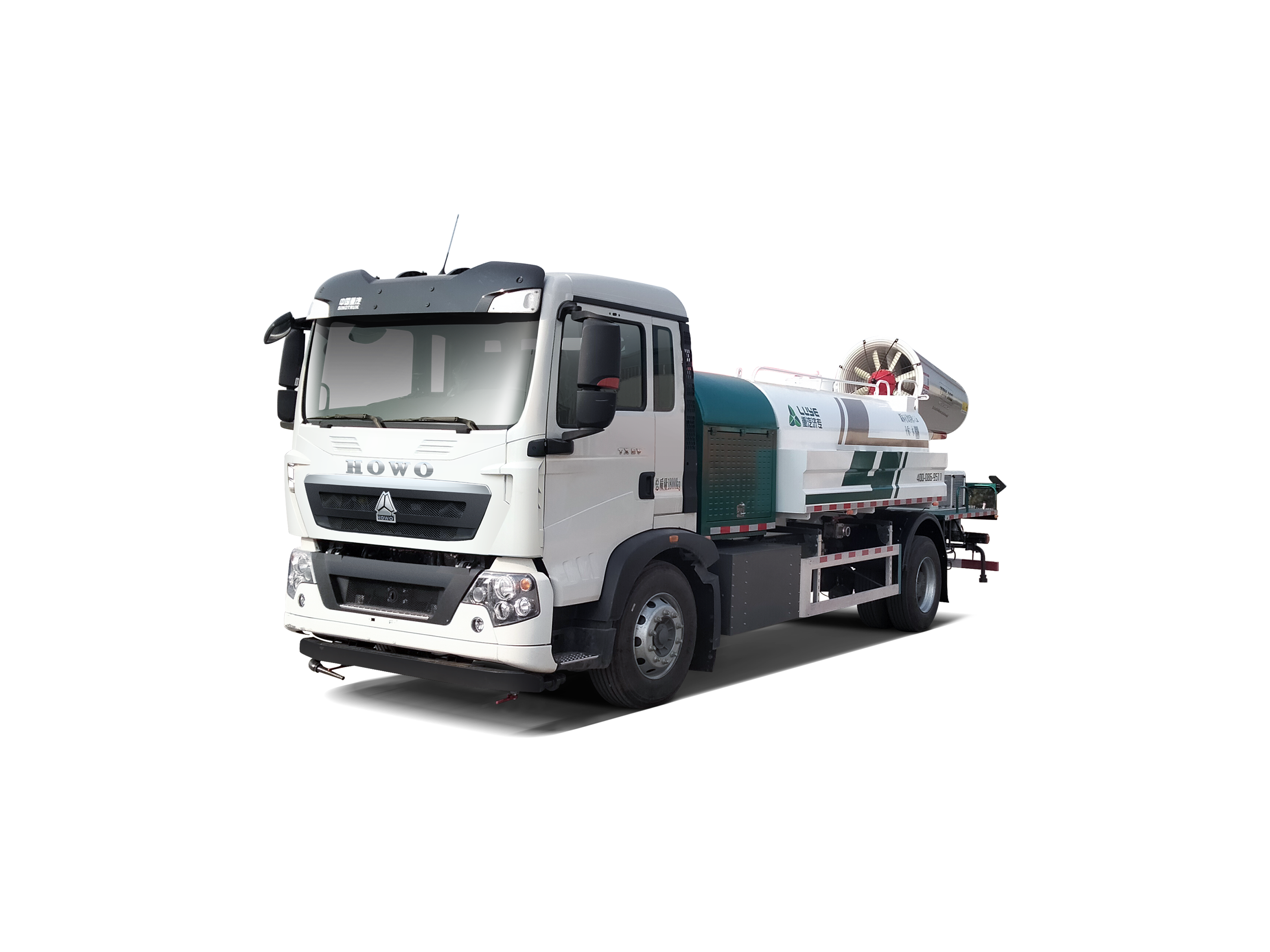采用中国重汽豪沃纯电动专用电动底盘改装而成,高度集成电驱桥驱动形式,取代电机+变速箱+车桥的模式,配电系统优化集成。采用环保除尘风送式喷雾机,结构紧凑,射程远,雾粒细小,覆盖面积大,可手动或遥控操纵。喷雾机利用微电机可左、右各90°旋转系统控制俯仰角可达-10°~60°,变换角度速度快,工作效率高。风筒采用双壁消音技术,有效降低风筒作业噪声。风筒控制智能化,可实现自动回中、自动左右循环作业等功能。