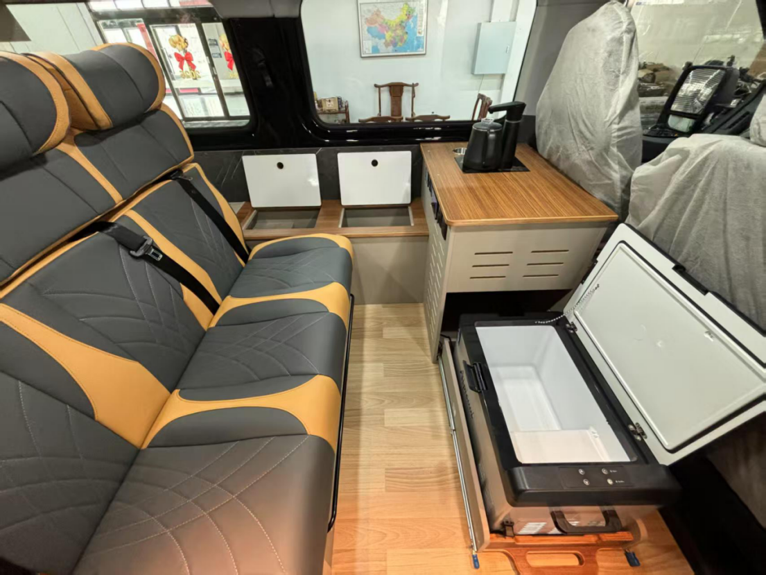 先锋官V移动咖啡车采用长2160mm,宽500mm的操作台,带来宽敞操作空间。咖啡机、微波炉、制冰机、110L对开门冰箱等专业设备打造户外移动咖啡厅。此外,车内还设有宽敞舒适的休憩区,让用户在旅行途中既能享受悠闲时光,又能通过经营咖啡车开启充满乐趣的别样生活。
