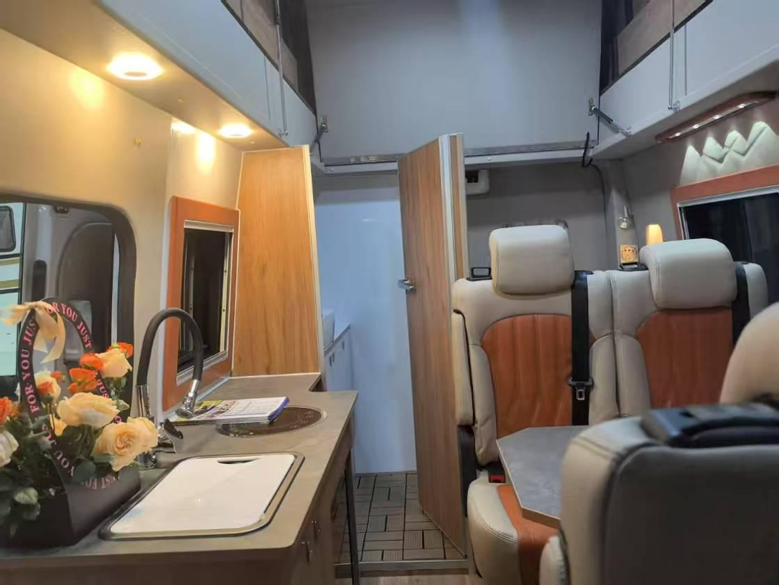 先锋官V宿营车秉持商务与休闲完美结合的理念,大气稳重的外观,适合商务接待等正式场合;配备可折叠小桌板,方便商务洽谈和家庭聚餐;厨房区和卫浴区设计合理,装备齐全,真正实现工作与生活一车兼得。