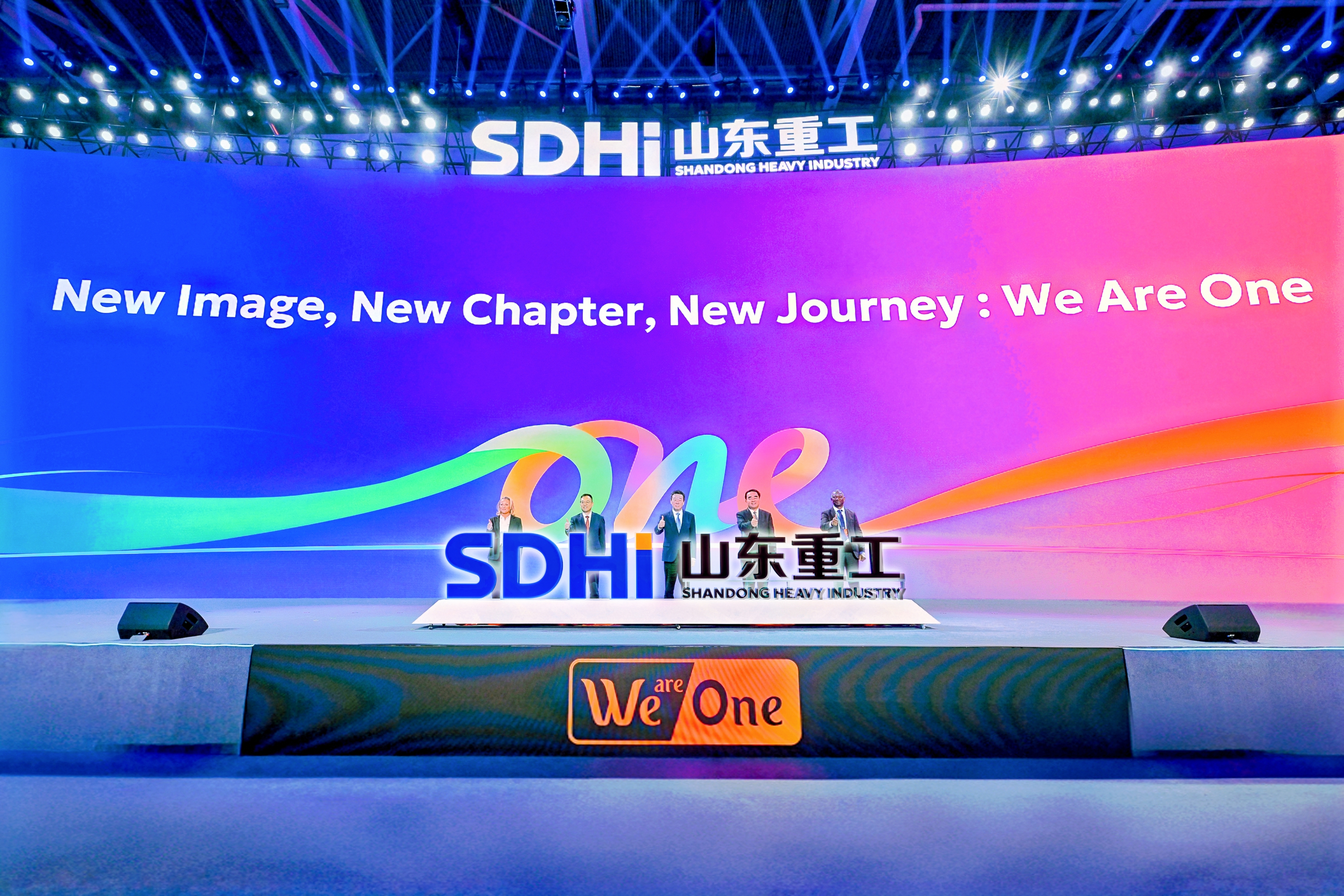 大会正式发布山东重工全球品牌标识,任刚、满慎刚、王志坚和战略合作伙伴代表、海外员工代表共同为品牌标识揭幕。